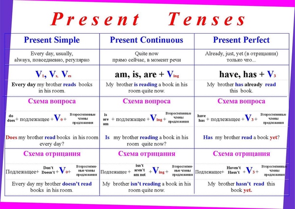 Когда употреблять? Molly often visits her granny. Расписание. The ship leaves at 8 sharp. Факты, законы природы. It often rains in autumn. Правила употребления Present Simple. | Когда употреблять? Действие происходит (длится)в данный момент. She is watching TV now. Действие происходит в данный период. I am reading M.Twain these days. Запланированное действие. I’m flying to Madrid. Правила употребления Present Continuous. | Когда употреблять? Действие завершено, но нет указание на момент совершения. She has done her homework. Действие завершено, нет указания на момент совершения и есть результат важный в данный момент. I have bought some flour, so we can bake a cake. Правила употребления Present Perfect. | Когда употреблять? Действие, которое длилось до настоящего момента (возможно, действие продолжается и сейчас). She has been waiting for you for 3 hours. Правила употребления Present Perfect Continuous. |