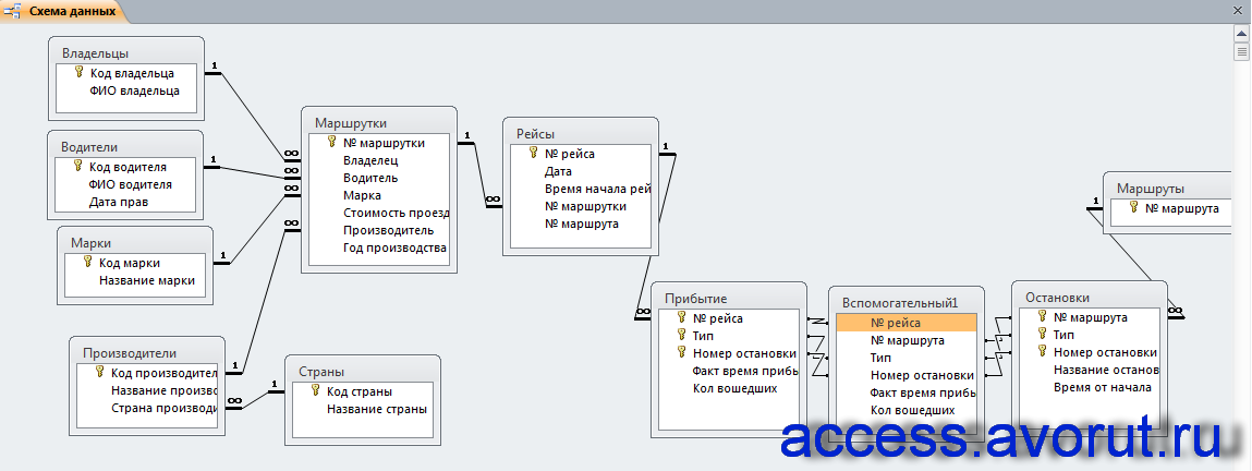 Основными объектами изучения являются Driver, Taxi, Route. Несколько водителей могут водить несколько такси, а несколько ткси могут ездить по разным маршрутам. По этому между сущностями Driver, Taxi, Route организованна связь многие-ко-многим. (Рис. 1).