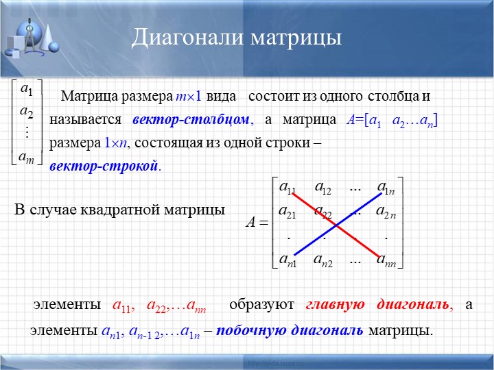 Определение. Последовательность элементов квадратной матрицы с одинаковыми индексами (i = j) называется главной диагональю матрицы (11, 22, 33,…,nn)/