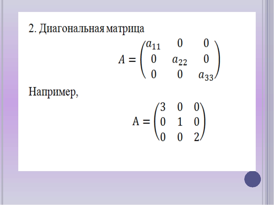 Если все элементы квадратной матрицы равны нулю, кроме элементов главной диагонали, то такая матрица называется диагональной.Однако некоторые элементы главной диагонали могут быть нулевыми, но не все элементы. Например,