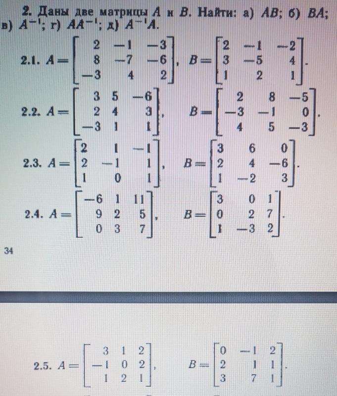 AB=(1−2323−1−312)⋅(102012120)=(1⋅1+(−2)⋅0+3⋅11⋅0+(−2)⋅1+3⋅21⋅2+(− 2)⋅2+3⋅02⋅1+3⋅0+(−1)⋅12⋅0+3⋅1+(−1)⋅22⋅2+3⋅2+(−1)⋅0(−3 )⋅1+1⋅0+2⋅1−3⋅0+1⋅1+2⋅2−3⋅2+1⋅2+2⋅0)=(44−21110−15−4)BA=(102012120 )⋅(1−2323−1−312)=(−507−453541).\begin{aligned} AB & = \begin{pmatrix} 1 & -2 & 3 \\ 2 & 3 & -1 \\ -3 & 1 & 2 \end{pmatrix} \cdot \begin{pmatrix} 1 & 0 & 2 \\ 0 & 1 & 2 \\ 1 & 2 & 0 \end{pmatrix} \\ & = \begin{pmatrix} 1 \cdot 1 + (-2) \cdot 0 + 3 \cdot 1 и 1 \cdot 0 + (-2) \cdot 1 + 3 \cdot 2 и 1 \cdot 2 + (-2) \cdot 2 + 3 \ cdot 0 \\ 2 \cdot 1 + 3 \cdot 0 + (-1) \cdot 1 и 2 \cdot 0 + 3 \cdot 1 + (-1) \cdot 2 и 2 \cdot 2 + 3 \cdot 2 + (-1) \cdot 0 \\ (-3) \cdot 1 + 1 \cdot 0 + 2 \cdot 1 и -3 \cdot 0 + 1 \cdot 1 + 2 \cdot 2 & -3 \cdot 2 + 1 \cdot 2 + 2 \cdot 0 \end{pmatrix} \\ & = \begin{pmatrix} 4 & 4 & -2 \\ 1 & 1 & 10 \\ -1 & 5 & -4 \end{pmatrix} \ \\\ BA & = \begin{pmatrix} 1 & 0 & 2 \\ 0 & 1 & 2 \\ 1 & 2 & 0 \end{pmatrix} \cdot \begin{pmatrix} 1 & -2 & 3 \\ 2 & 3 & -1 \\ -3 & 1 & 2 \end{pmatrix} \ \ & = \begin{pmatrix} -5 & 0 & 7 \\ -4 & 5 & 3 \\ 5 & 4 & 1 \end{pmatrix}.