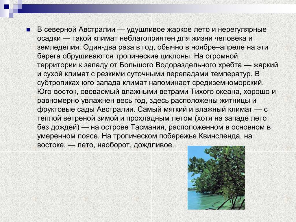 Материковой Австралия характерны 3 климатических пояса: субтропический, субэкваториальный, тропический. Остров Тасмания расположен в умеренном климатическом поясе.