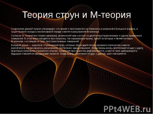 Это название неизвестной теории всего, которая объединила бы вместе все пять теорий суперструн и супергравитацию в 11 измерениях.