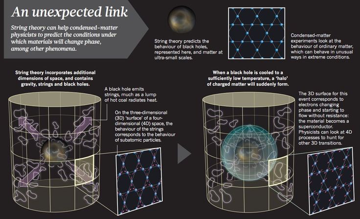Эта теория, как известно, утверждает, что гравитоны, как и электроны, фотоны и всё остальное, являются не точечными частицами, а неуловимо крохотными резиночками энергии, или «струнами», вибрирующими разными способами. Интерес к теории струн резко возрос в середине 1980-х, когда физики поняли, что она даёт математически непротиворечивое описание квантовой гравитации. Но пять известных версий теории были «пертурбационными», то есть, переставали работать в определённых условиях. Теоретики могли подсчитать, что происходит, когда две гравитонные струны сталкиваются на высоких энергиях, но оказывались бессильны перед слиянием гравитонов настолько экстремальным, что оно порождает чёрную дыру.