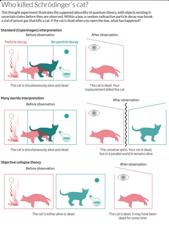 Как Шредингер обычно указывал любому, кто готов был его слушать, в уравнениях (включая его знаменитое волновое уравнение) нет ничего о коллапсе. Это было то, что Бор прикрутил к теории, чтобы «объяснить», почему мы видим только один результат эксперимента — мертвую кошку или живую кошку, а не смесь, суперпозицию состояний. Но поскольку мы обнаруживаем только один результат — одно решение волновой функции — это не обязательно означает, что альтернативных решений не существует. В статье, опубликованной им в 1952 Шредингер указал на нелепость ожидания коллапса квантовой суперпозиции только потому, что мы смотрим на нее. Он писал, что «совершенно абсурдно» то, что волновая функция должна «контролироваться двумя совершенно разными способами, иногда с помощью волнового уравнения, а иногда с помощью прямого вмешательства наблюдателя, не контролируемого волновым уравнением».