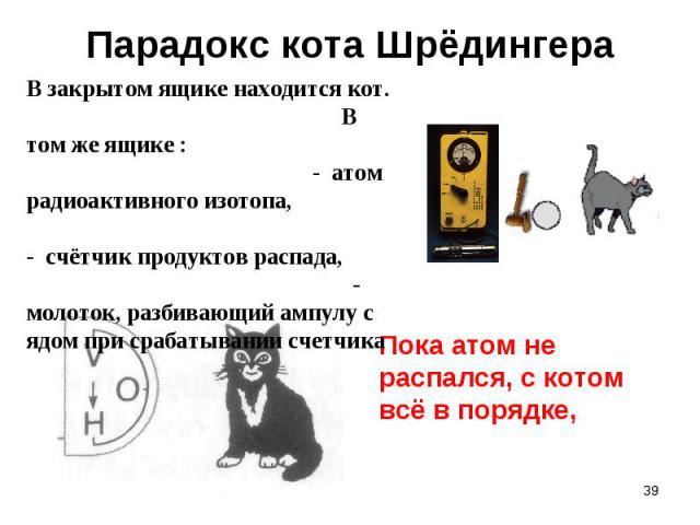 Как пример несостоятельности таких представлений, он утверждал, что в таком случае микромир влиял бы на макрообъекты. Теория кота Шредингера гласит следующее: если в герметичную коробку поместить живой организм (например, кота) и капсулу с ядовитым газом, которая открывается, если некий радиоактивный элемент распадается, и остается закрытой, если распад не происходит, то до открытия коробки получаем парадокс. Согласно квантовым представлениям, атом радиоактивного элемента с некоторой вероятностью за определенный промежуток времени распадется.