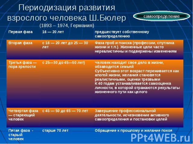 К Бюлер (Австрия) намеревался представить весь путь развития от обезьяны до взрослого культурного человека как восхождение по единой биологической лестнице, проанализировать процесс превращения ребёнка (существа пассивного, беспомощного, лишённого всяких душевных движений) – в человека.