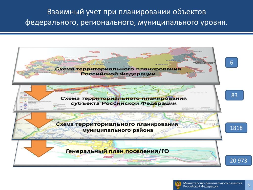 5. Подготовка документов территориального планирования Российской Федерации осуществляется на основании отраслевых документов стратегического планирования Российской Федерации, в том числе генеральных схем в топливно-энергетических и транспортных отраслях, стратегии национальной безопасности Российской Федерации, иных концептуальных и доктринальных документов в области обеспечения безопасности с учетом положений стратегии социально-экономического развития Российской Федерации, стратегии пространственного развития Российской Федерации, национальных проектов, межгосударственных программ, государственных программ Российской Федерации, инвестиционных программ субъектов естественных монополий, решений органов государственной власти, иных главных распорядителей средств соответствующих бюджетов, предусматривающих создание объектов федерального значения, а также сведений, содержащихся в федеральной государственной информационной системе территориального планирования (далее также – информационная система территориального планирования).