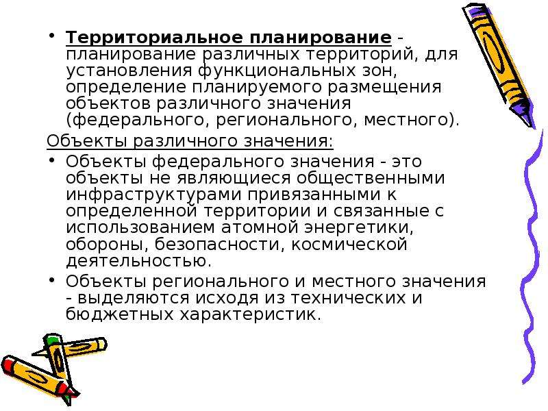 1. Территориальное планирование направлено на определение в документах территориального планирования назначения территорий исходя из совокупности социальных, экономических, экологических и иных факторов в целях обеспечения устойчивого развития территорий, развития инженерной, транспортной и социальной инфраструктур, обеспечения учета интересов граждан и их объединений, Российской Федерации, субъектов Российской Федерации, муниципальных образований.