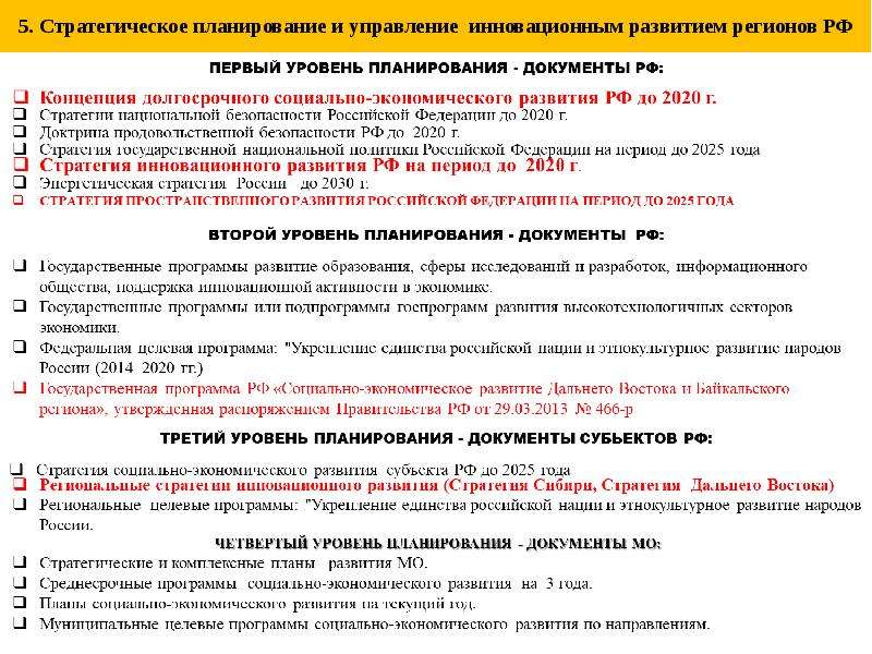 5.1. Подготовка документов территориального планирования двух и более субъектов Российской Федерации, документов территориального планирования субъекта Российской Федерации осуществляется на основании стратегий социально-экономического развития субъектов Российской Федерации с учетом положений стратегии пространственного развития Российской Федерации, стратегий социально-экономического развития макрорегионов, отраслевых документов стратегического планирования Российской Федерации, межгосударственных программ, государственных программ Российской Федерации, национальных проектов, государственных программ субъектов Российской Федерации, инвестиционных программ субъектов естественных монополий, решений органов государственной власти, иных главных распорядителей средств соответствующих бюджетов, предусматривающих создание объектов регионального значения, а также сведений, содержащихся в информационной системе территориального планирования.