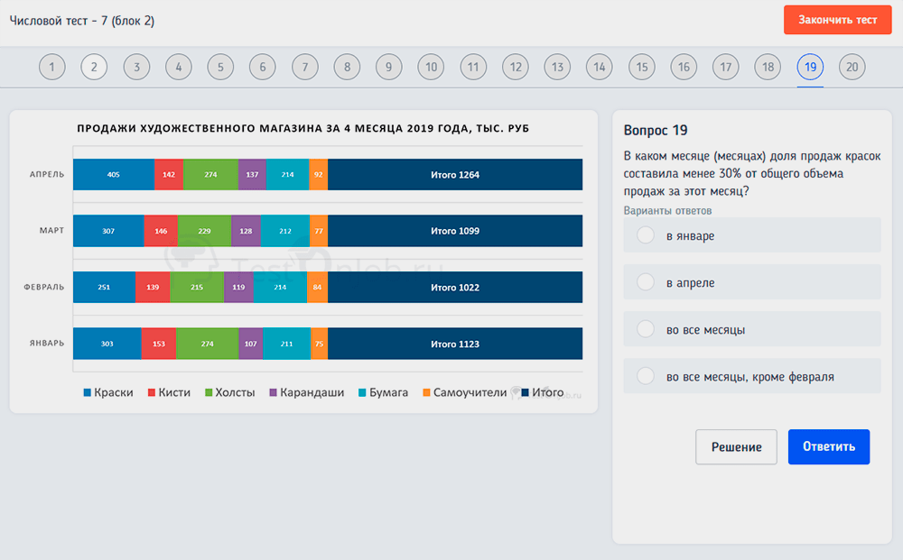 Дополнительно вы можете бесплатно пройти пробные числовые, вербальные и логические тесты в нашей системе, выбрав режим тестирования “Время на вопрос”. По итогам каждого теста вы также получите отчет с оценкой вашего уровня подготовки к тестированию. Кроме того, вы сможете посмотреть все допущенные вами ошибки и разъяснения правильных решений, чтобы в будущем подобные вопросы уже не вызывали у вас затруднений.