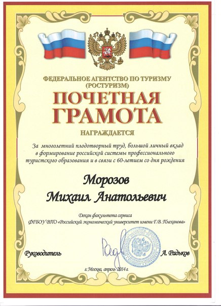 Почетная грамота Федерального агентства по туризму (март 2012 года)