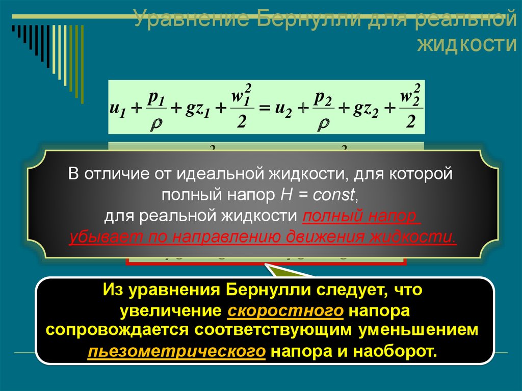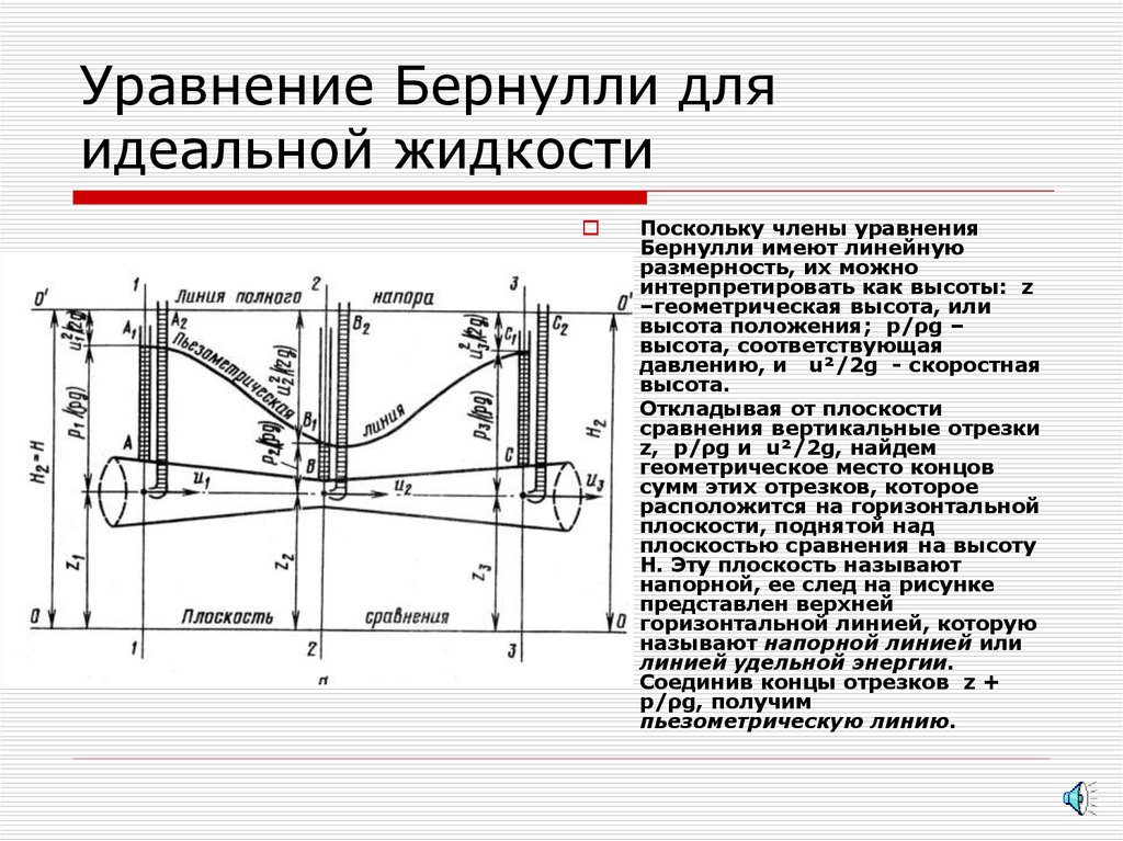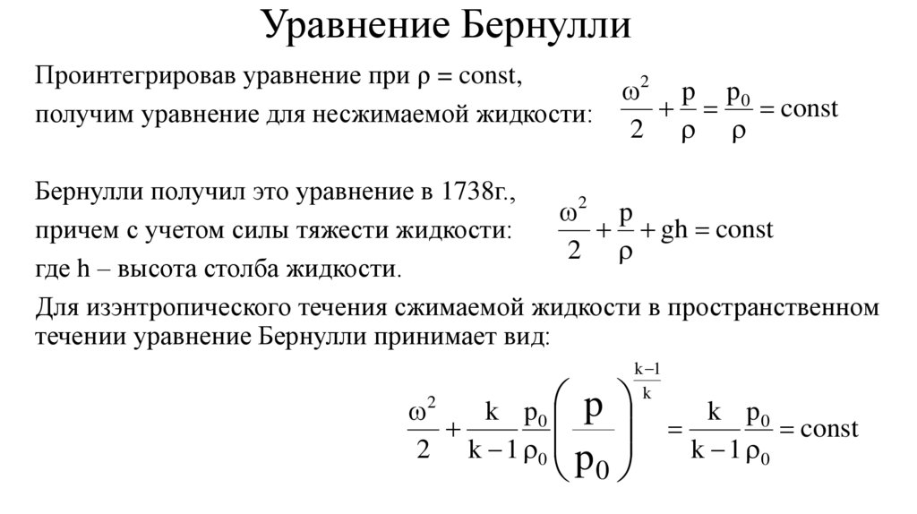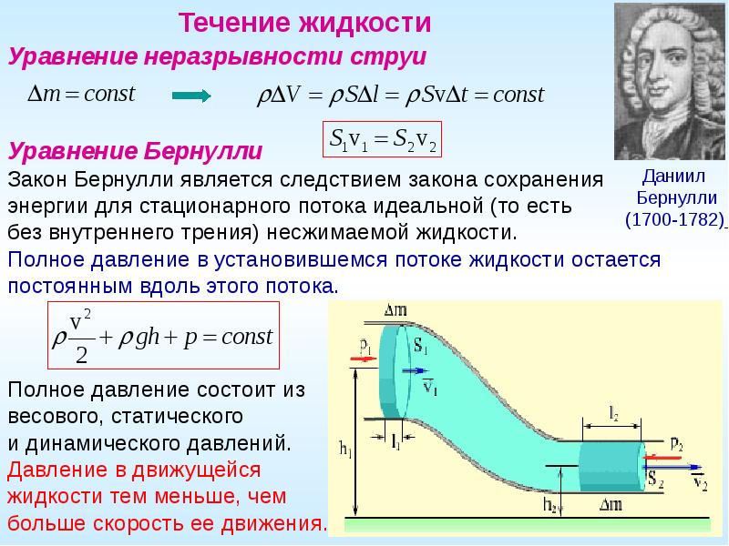 Бернулли. Данное выражение демонстрирует закон сохранения энергии движущейся жидкости и создает