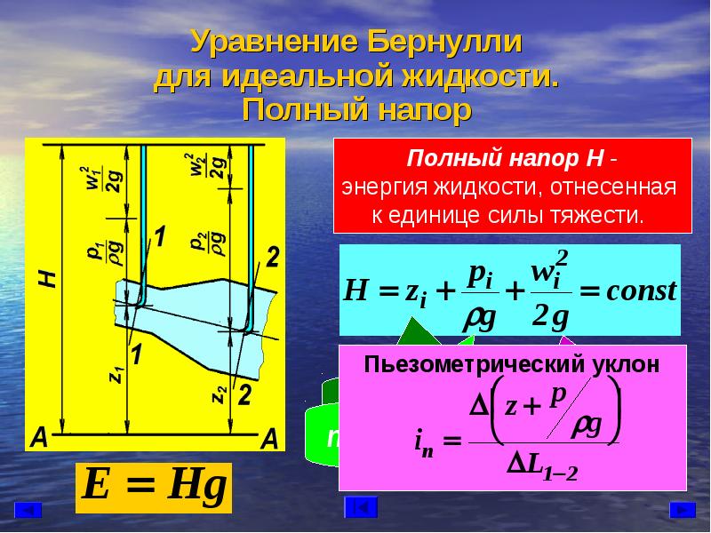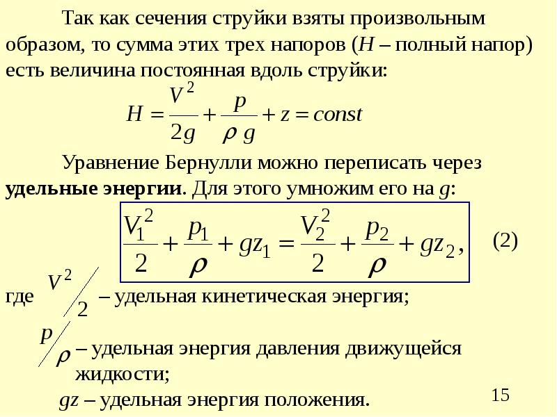 Таким образом, опираясь на уравнение Бернулли, мы получим, что в любом сечении полная удельная энергия идеальной жидкости остается постоянной.