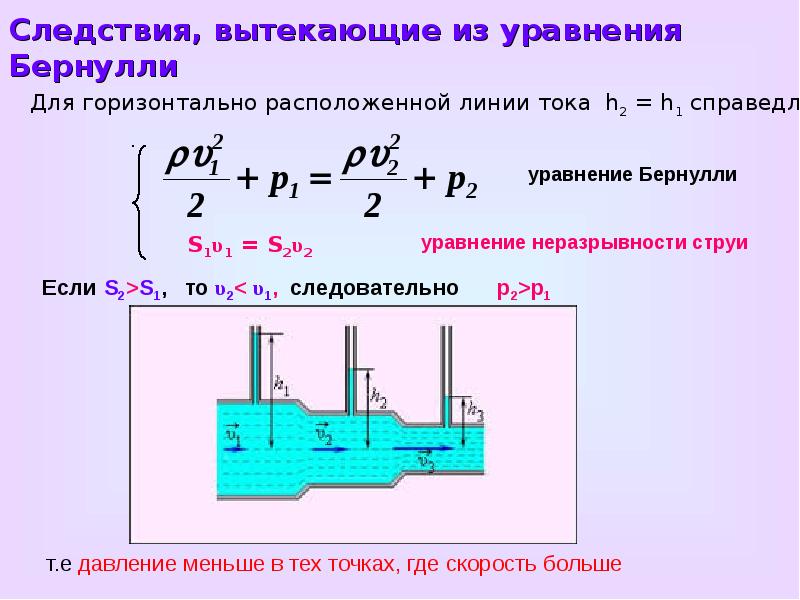 Согласно эффекту Вентури, давление жидкости уменьшается с увеличением ее скорости. Уравнение Бернулли выражает это соотношение в математических терминах и включает термин, обозначающий высоту жидкости. Чтобы проиллюстрировать эту взаимосвязь, представьте, что вода движется по водной горке. В верхней части, где вы загружаете, вода движется медленно, ее толкает только вода позади нее. Когда горка опускается, вода быстро устремляется вниз, увеличивая скорость по мере падения.Таким образом, на скорость также влияет сила тяжести по высоте. Когда все эти члены связаны и масштабируются для плотности и силы тяжести, мы получаем уравнение Бернулли, где v – скорость жидкости, ρ – плотность жидкости, h – относительная высота, а P – давление. Обратите внимание, что у константы также есть единицы измерения давления.