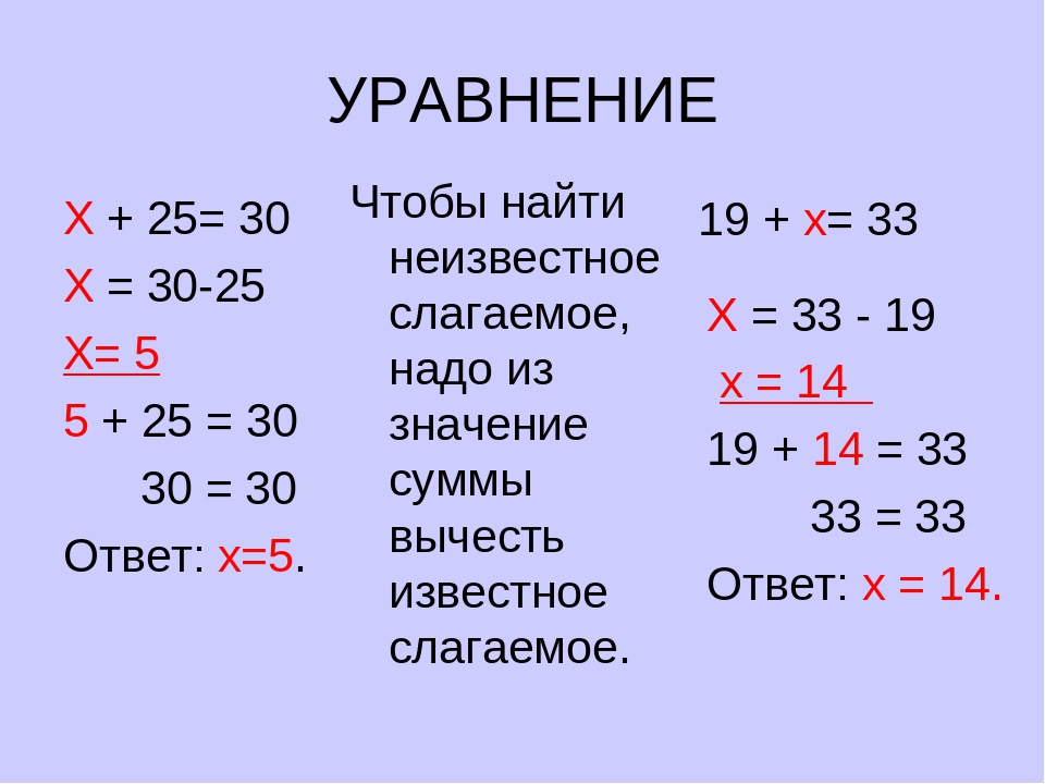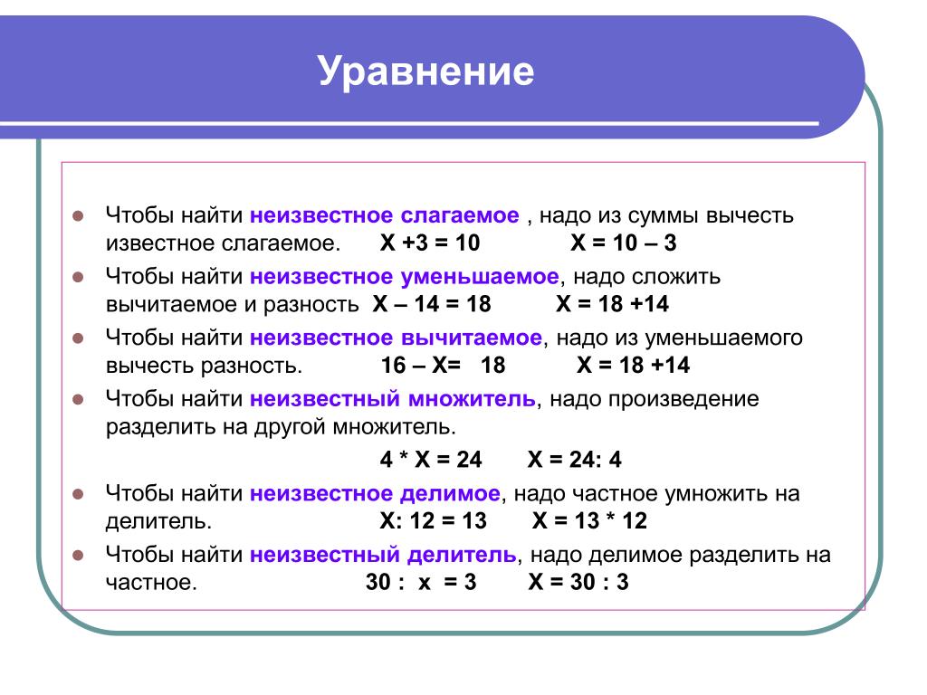 1) слагаемого: чтобы найти неизвестное слагаемое, надо из суммы вычесть известное слагаемое.