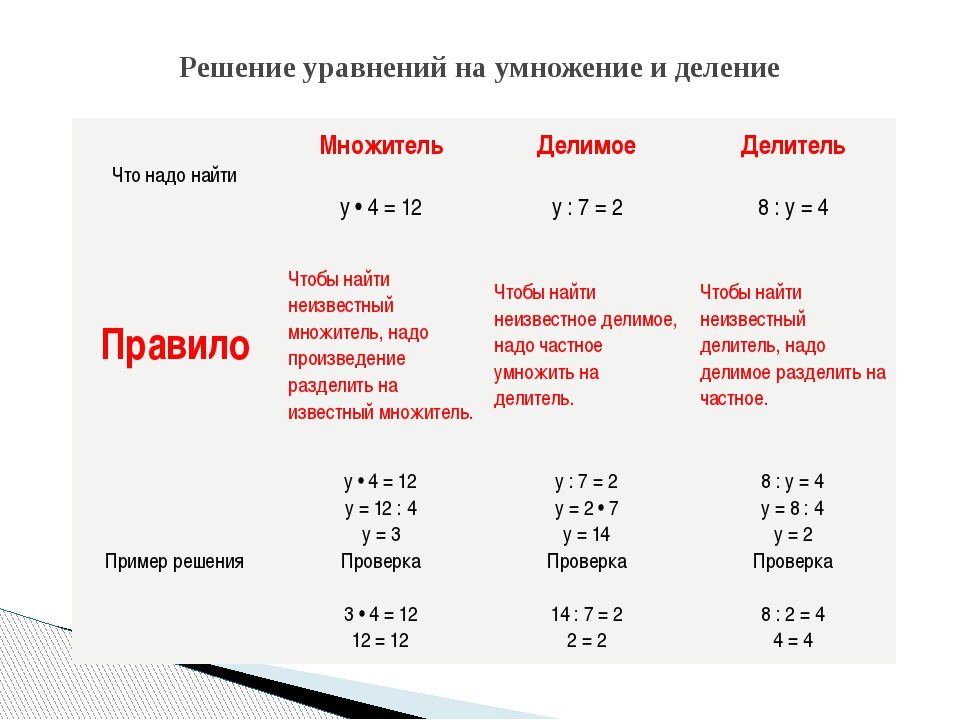 4) множителя: чтобы найти неизвестный множитель, надо произведение разделить на известный множитель.