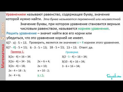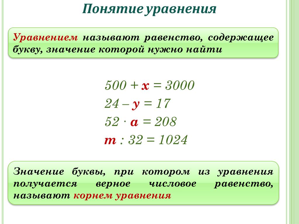 Уравнение – это равенство, содержащее букву, значение которой надо найти. Например: + 5 = 10. Чтобы решить данное уравнение, требуется найти такое число, при подстановке которого в данное равенство вместо буквы (то есть найти значение переменной), числовое равенство будет верным. В нашем случае вместо необходимо подставить 5. Говорят, что число 5 – корень уравнения + 5 = 10.