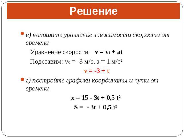 Третье уравнение — это выражение для скорости при равнозамедленном движении с постоянным ускорением. Ускорение при этом направлено против скорости.