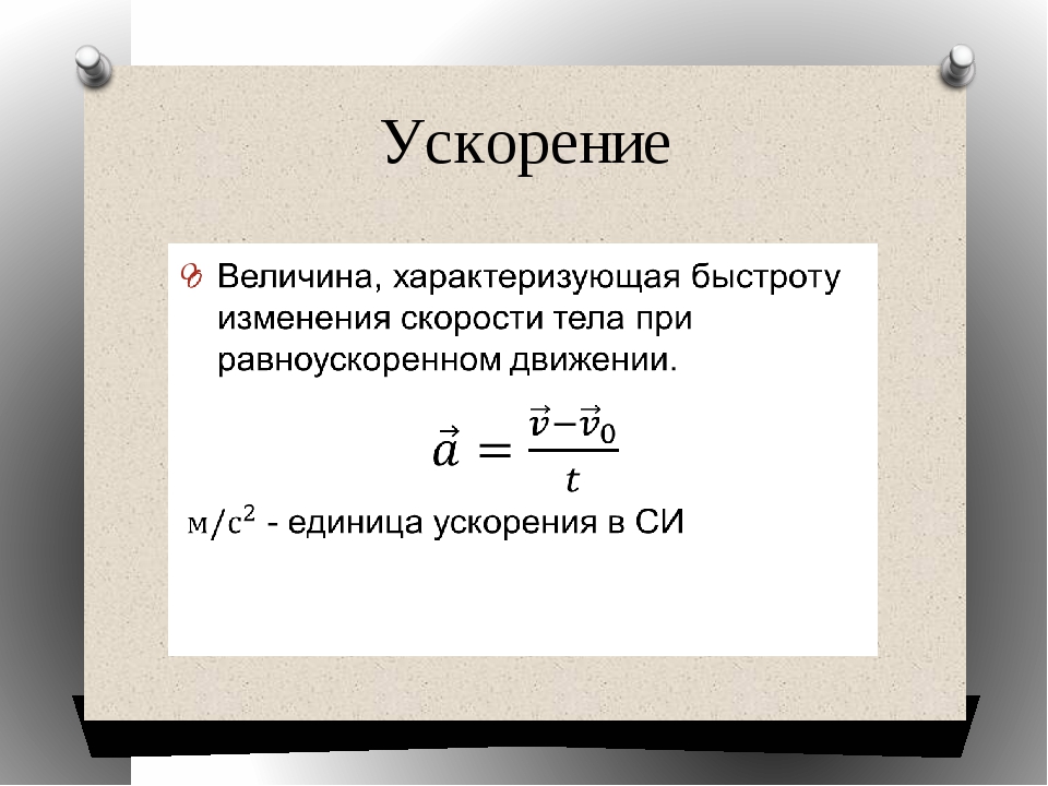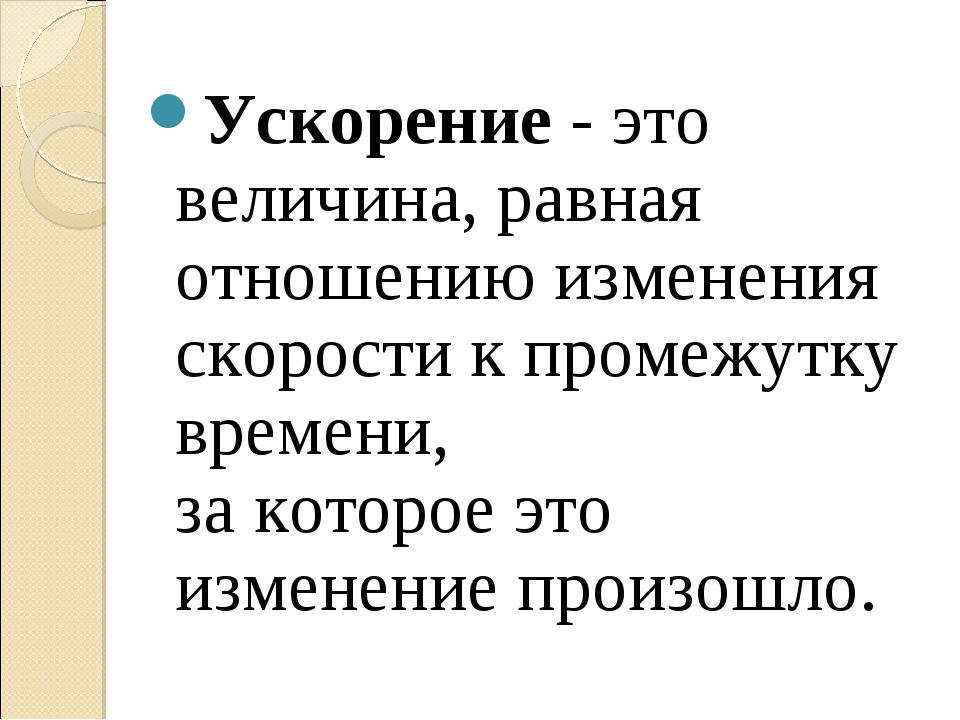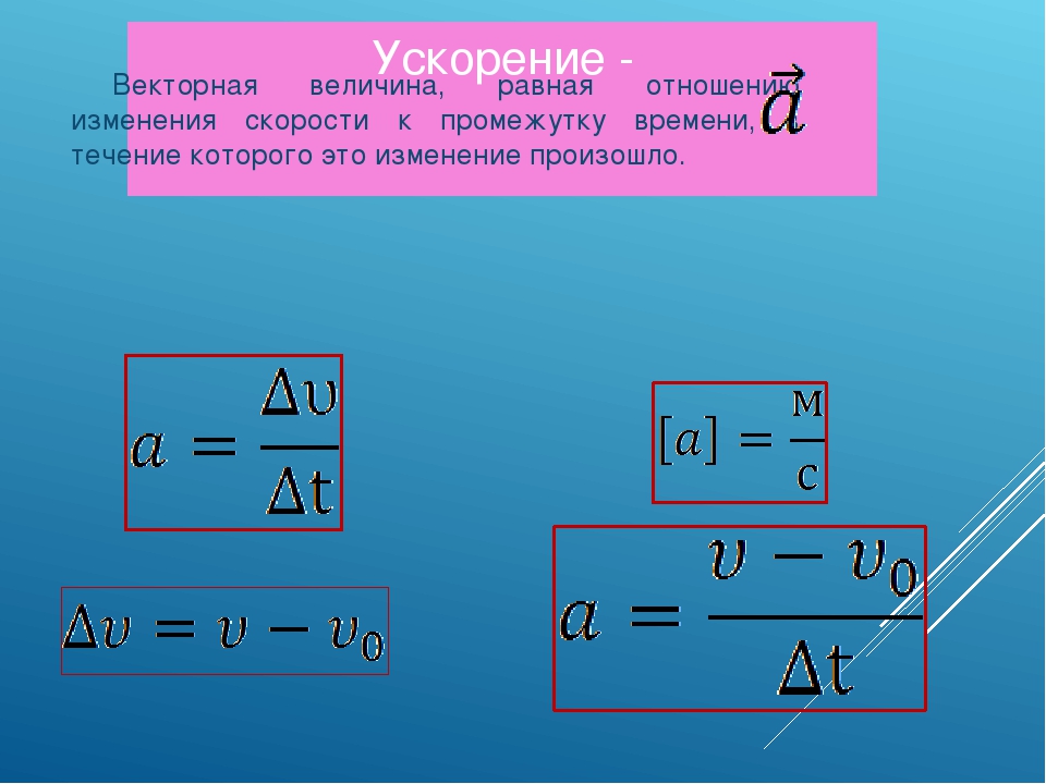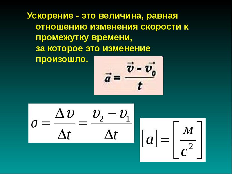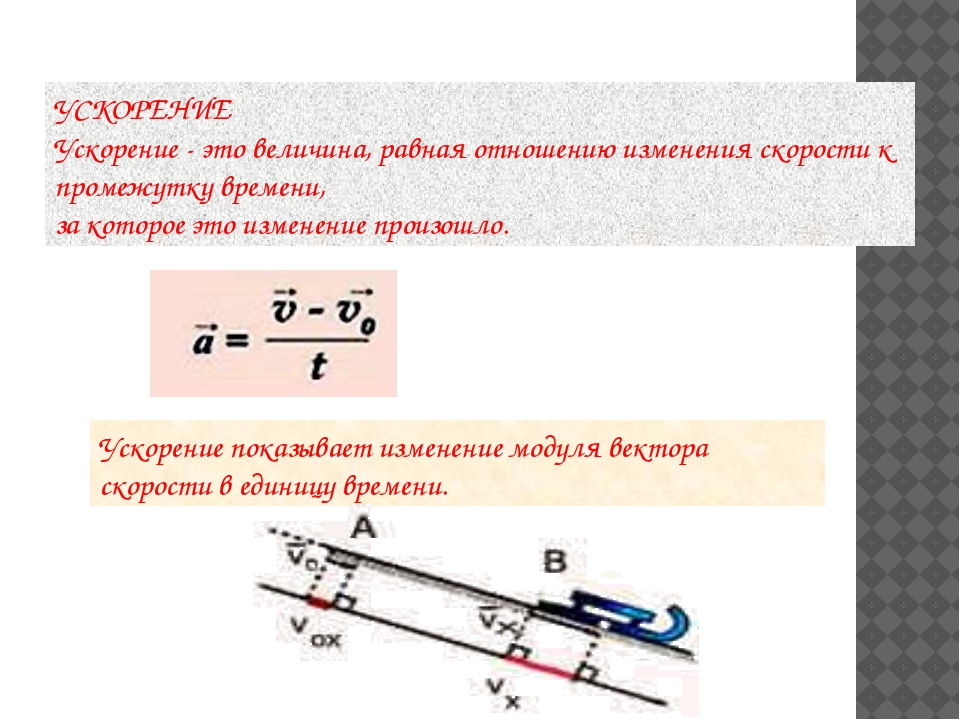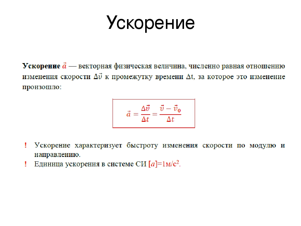 Ускорение — это векторная физическая величина, характеризующая быстроту изменения скорости, численно равная отношению изменения скорости к промежутку времени, в течение которого это изменение произошло.