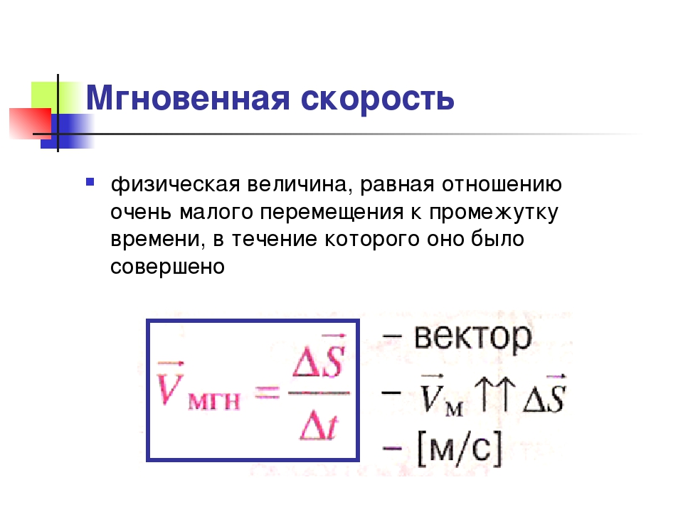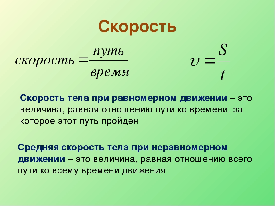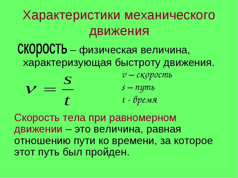 Скорость равномерного прямолинейного движения — это векторная физическая величина, равная отношению перемещения тела S за любой промежуток времен к значению этого промежутка t:
