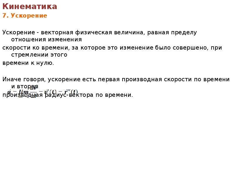 2) Физическая величина, равная отношению изменения скорости к тому физически малому промежутку времени, за которое это изменение произошло