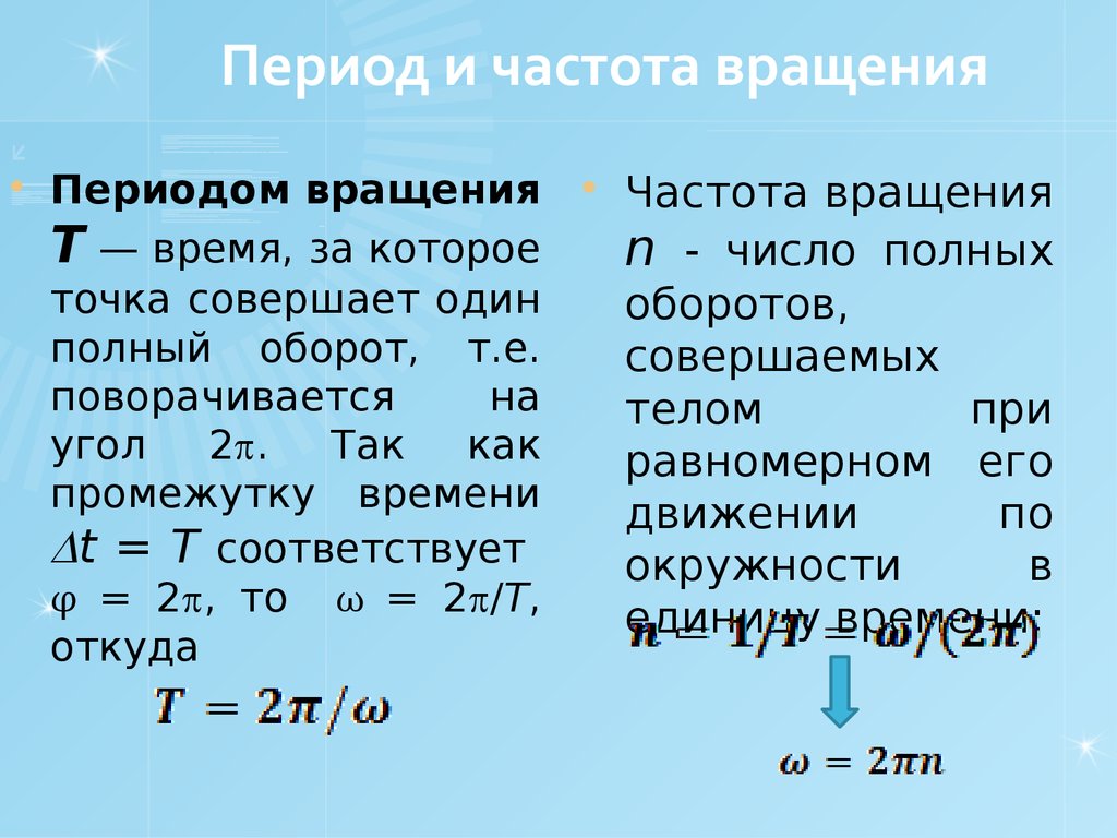 - Периодом вращения называется время, затраченное телом на совершение одного полного оборота по окружности: