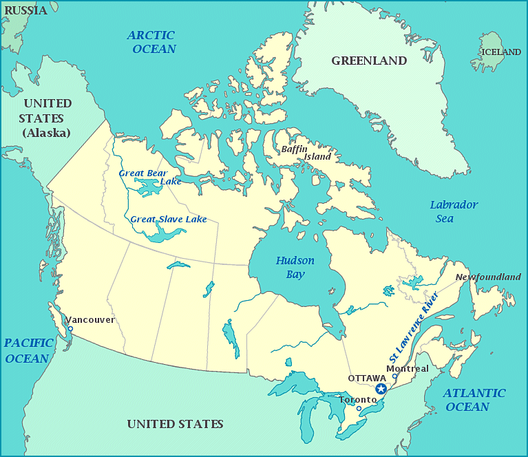 Карта расположения Канадытакже показывает, что она имеет огромную географическую территорию, простирающуюся от Тихого океана на западе до Атлантического океана на востоке; с северной стороны он также образует береговую линию с Северным Ледовитым океаном. По площади Канада является второй по величине страной в мире после России.