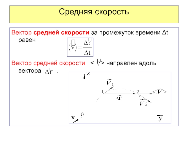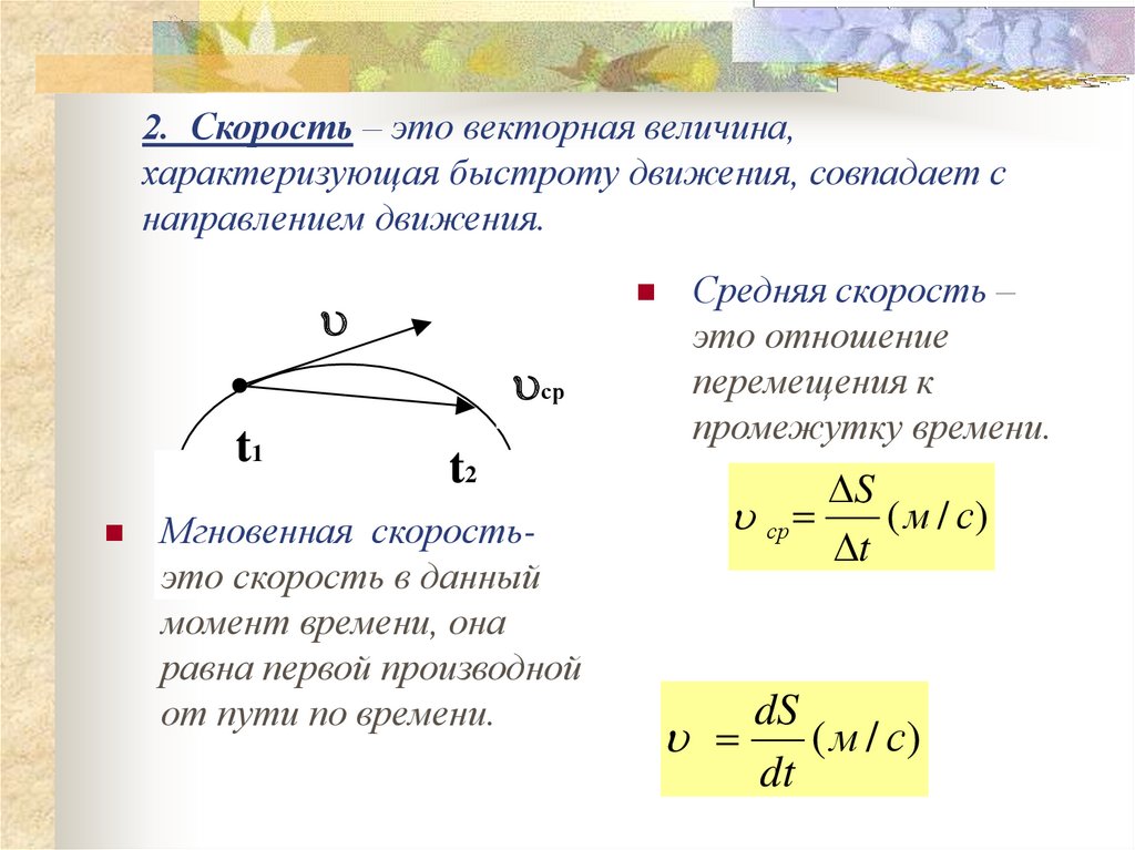 С к о р о с т ь – это векторная величина, характеризующая быстроту и на-правление движения точки в данной системе отсчета.