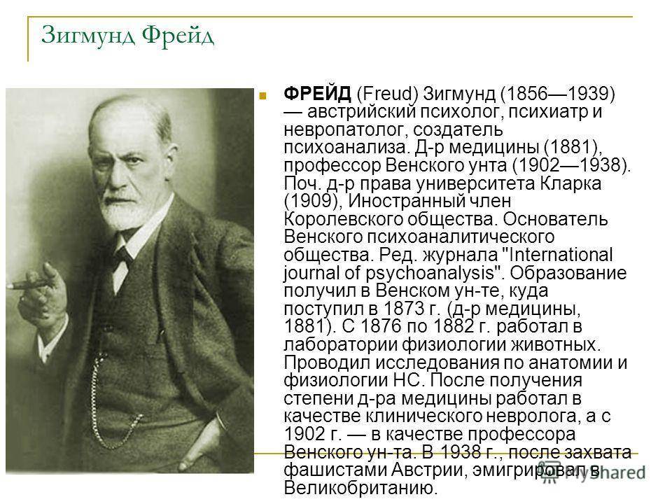 Следующее было адаптировано с веб-сайта Википедии. Зигмунд Фрейд (1856-1939) обычно упоминается как «отец психоанализа», и его работа оказала огромное влияние на массовое воображение, популяризируя такие понятия, как бессознательное, защитные механизмы, Фрейдистские оговорки и символика сновидений, а также оказывают долгосрочное влияние на такие разные области, как литература, кино, марксистские и феминистские теории, литературная критика, философия и психология. Фрейд наиболее известен своими теориями бессознательного, особенно с участием механизма вытеснения; его новое определение сексуального желания как мобильного и направленного на самые разные объекты; и его терапевтическая техника, особенно его понимание переноса в терапевтических отношениях и предполагаемой ценности снов как источников понимания бессознательных желаний. Сигизмунд Шломо Фрейд родился в еврейской семье в Приборе (Фрайберг на немецком языке), Моравия, в Австрийской Империи (ныне принадлежащей Чешской Республике).Он получил свое имя в честь трех польских королей Зигмунта (Сигизмунда): Зигмунт Старый, Зигизмунд Август и Зигмунт III Ваза. Это была старая семейная традиция после того, как Фрейды жили в Польше во времена королей Зигмунтов (XVI и XVII). В 1877 году, в возрасте 21 года, он сократил свое имя до «Зигмунд». Хотя он был первенцем из трех братьев и пяти сестер среди детей своей матери, у Зигмунда были старшие сводные братья от предыдущего брака его отца. Его семья была ограничена в финансах и жила в многолюдной квартире, но его родители зарабатывали все усилия для развития своего интеллекта (часто предпочитая Зигмунда своим братьям и сестрам), что было очевидно с раннего возраста.Зигмунд занял первое место в своем классе за шесть лет в «Гимназии», своей гимназии. Он продолжал посещать Венский университет, 17 лет, с 1873 по 1881 год. Мало что известно о ранней жизни Фрейда, так как он уничтожил свои личные бумаги по крайней мере дважды, один раз в 1885 году и еще раз в 1907 году. Кроме того, части его личной переписки и неопубликованные документы тщательно охранялись в Зигмунде. Архивы Фрейда в Библиотеке Конгресса на протяжении многих лет были доступны лишь нескольким членам внутреннего круга психоанализа.Большинство из этих ранее ограниченных документов теперь рассекречены и доступны исследователям, которые посетите Библиотеку Конгресса в Вашингтоне, округ Колумбия. В 1886 году Фрейд вернулся в Вену и, открыв частную практику, специализирующуюся на нервных и мозговых расстройствах, женился на Марте Бернейс. Часто ходят слухи, что позже у него был роман со своей невесткой Минной Бернейс. (К.Г. Юнг утверждал, что это так), и журнал гостиницы от 13 августа 1898 года, кажется, поддерживает это утверждение. Фрейд экспериментировал с гипнозом на своих самых истеричных и невротических пациентах, но в конце концов отказался от этой практики. Одна теория состоит в том, что он сделал это потому, что у него не очень хорошо получалось. Он перешел на укладывание пациентов на кушетку и поощрение их говорить все, что приходит им в голову, практика, называемая свободными ассоциациями. В свои 40 лет Фрейд «страдал множеством психосоматических расстройств, а также чрезмерным страхом смерти и другими фобиями». [3] В это время Фрейд был вовлечен в задачу исследования своих собственных снов, 