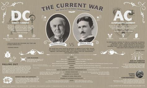 Его заклятый враг и бывший босс, Томас Эдисон, был культовым американским изобретателем лампочки, фонографа и движущегося изображения. Два враждующих гения вели «Войну токов» в 1880-х годах за то, чья электрическая система будет питать мир — система переменного тока (AC) Теслы или конкурирующая электрическая энергия постоянного тока (DC) Эдисона.