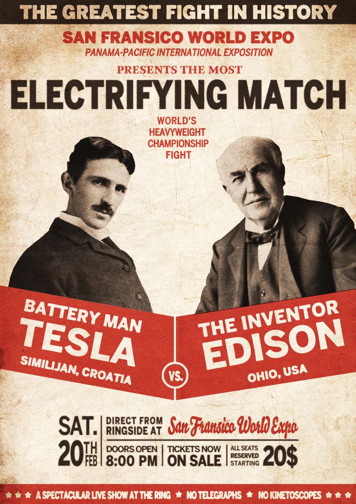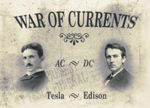 Параллельно с разработками Эдисона, основавшего «Эдисон Электрик Лайт» и запатентовавшего всю систему производства и распространения постоянного тока вкупе с долгоживущей лампочкой, «Вестингауз Электрик» предлагала освещать города, используя более экономичную технологию с переменным током, — она позволяла при помощи трансформаторов повышать электрическое напряжение для доставки энергии на большие расстояния, а затем — понижать для использования в быту. Эдисон не мог делать это с постоянным током, и потому потребители оказывались привязаны к территории вблизи электростанций.