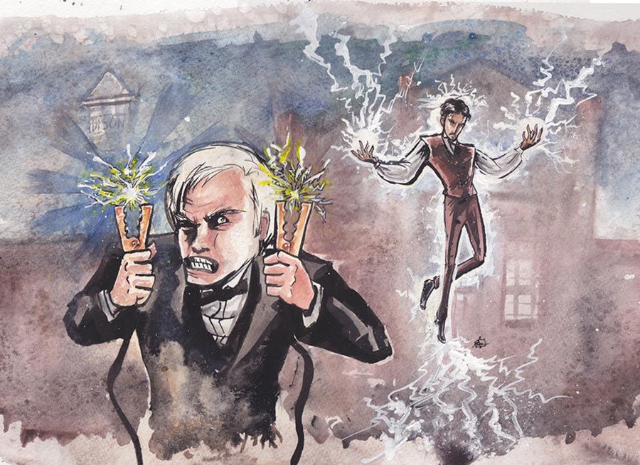 Тем не менее Гомесу-Рехону куда интереснее оказалось развеивать ореол, окружающий образ изобретателя, — и речь даже не конкретно об Эдисоне. «Война токов» развернулась во времена, когда Соединенные Штаты были одержимы самой концепцией изобретательства. Создание новых аппаратов и улучшение уже существующих превратилось чуть ли не в национальную идею все еще довольно молодой страны, а сами изобретатели стали знаменитостями наподобие сегодняшних поп-звезд.