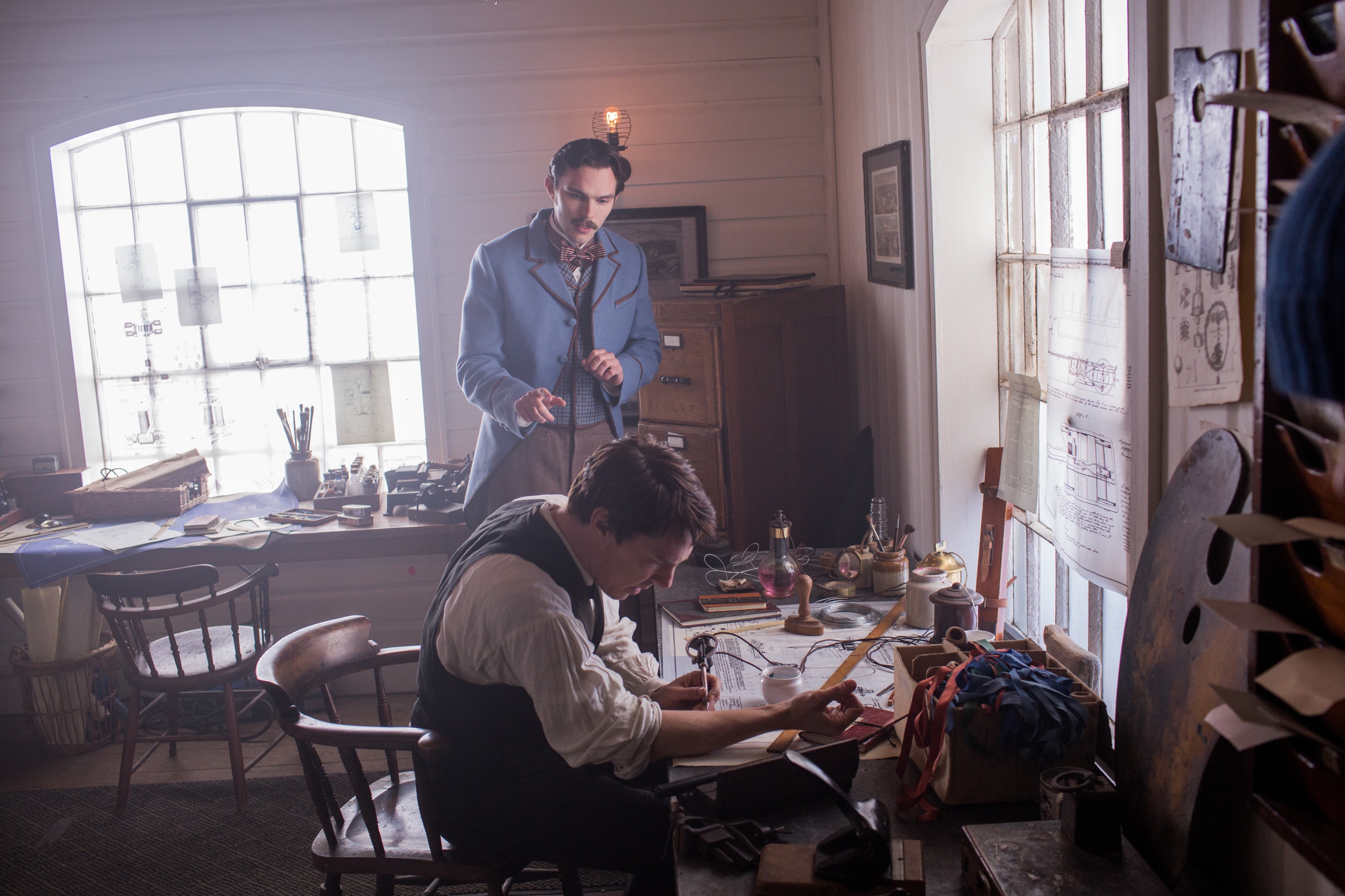 Мы видим, как семейная жизнь Эдисона с женой Мэри (Таппенс Миддлтон) отходит на второй план по сравнению с его работой в его лаборатории в Менло-Парке; черта, которая становится более резкой после личной трагедии. Майкл Шеннон играет Джорджа Вестингауза, разработчика пневматических тормозов для железных дорог, в стоической и сосредоточенной манере и в близких отношениях со своей женой Маргаритой (Кэтрин Уотерстон). Николас Холт изображает Николу Теслу, человека блестящего ума, контрастирующего с причудливыми и привередливыми манерами.Двумя другими ключевыми игроками здесь являются Мэтью Макфайден в роли Дж. П. Моргана, банкира, который финансирует большую часть работы, и Том Холланд в роли Сэмюэля Инсалла, верного помощника Эдисона.