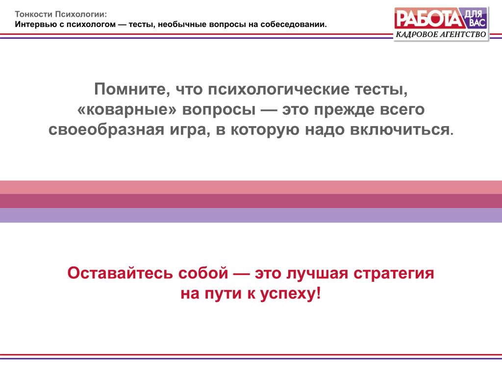 Представители отдела кадров и не IT-руководители качественно выполняют свою работу и тоже хотят тебя о чем-нибудь спросить, но некоторые из них удивляют меня все больше и больше. Руководитель одной из контор устроил мне даже блиц-опрос с таймером. Если раньше обходились двумя вопросами: “Кем Вы видите себя через 5 лет?” и “Что Вас не устраивает на старом месте работы? Сейчас же, все вокруг только и говорят, что о психологии, вот и появляются подобные вопросы.