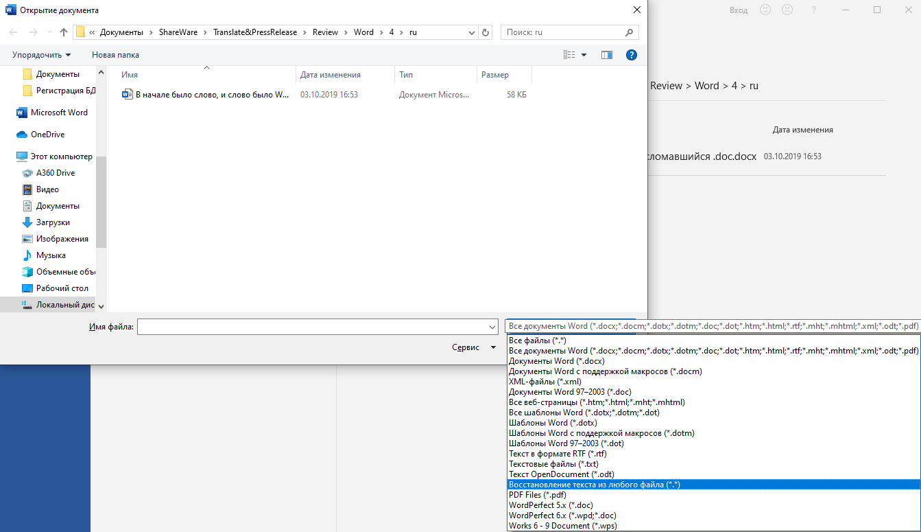 - Откроется диалоговое окно «Открыть» со списком несохраненных документов Word с возможностью восстановления. Выберите документ Word, который вы хотите восстановить, и нажмите кнопку «Открыть».
