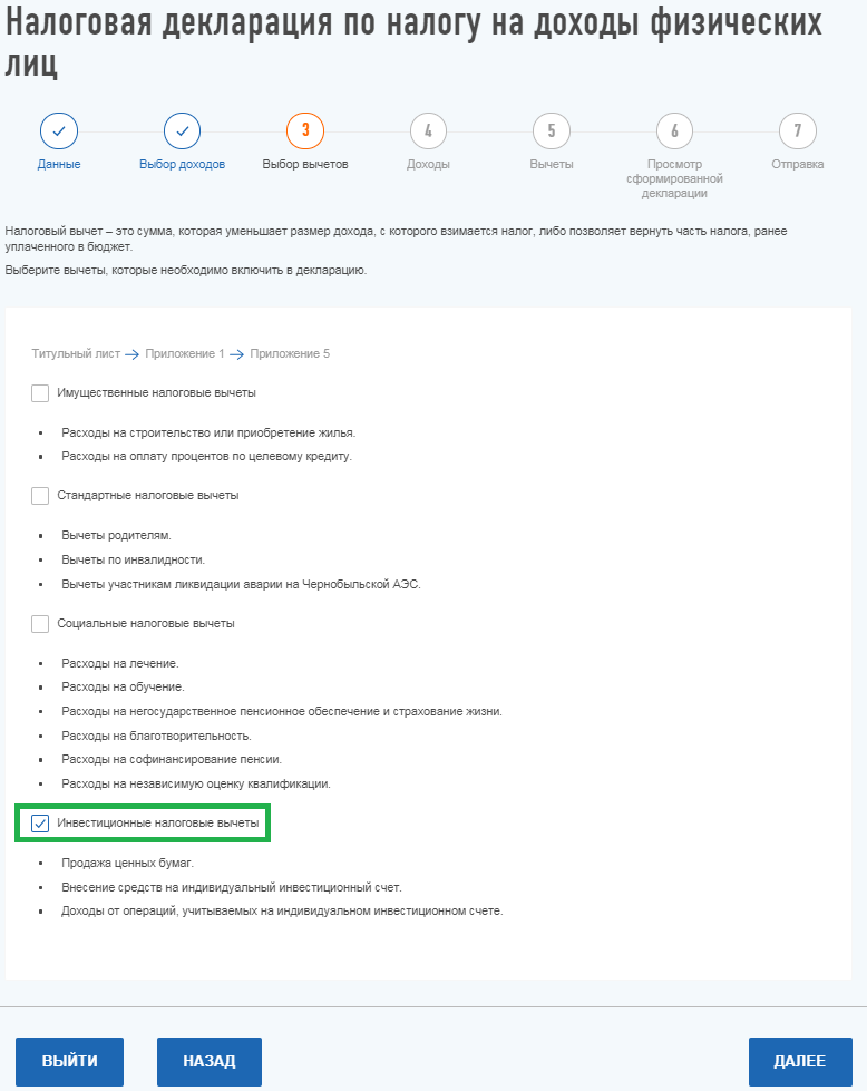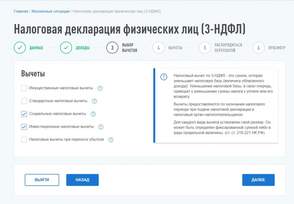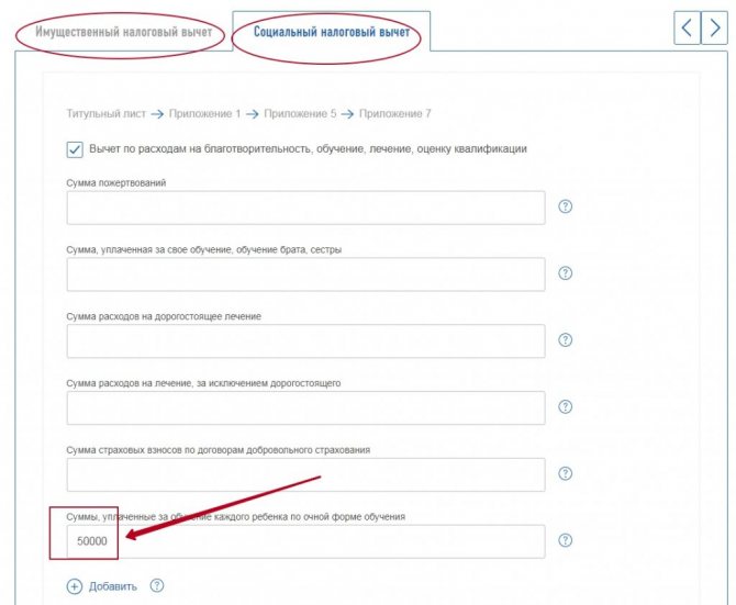 Например, если вы хотите получить вычет на покупку недвижимости и лечение, то заполняете две вкладки: «Имущество» и «Социальные».