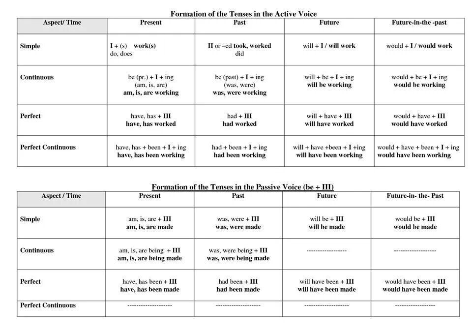 Залежно від того, яку форму вони приймуть, можна описати різні аспекти кожного з цих часів. Таких форм всього 4 в англійській: Simple, Continuous, Perfect, Perfect Continuous (вони допомагають розставити потрібні акценти в мові та передати події в фарбах).