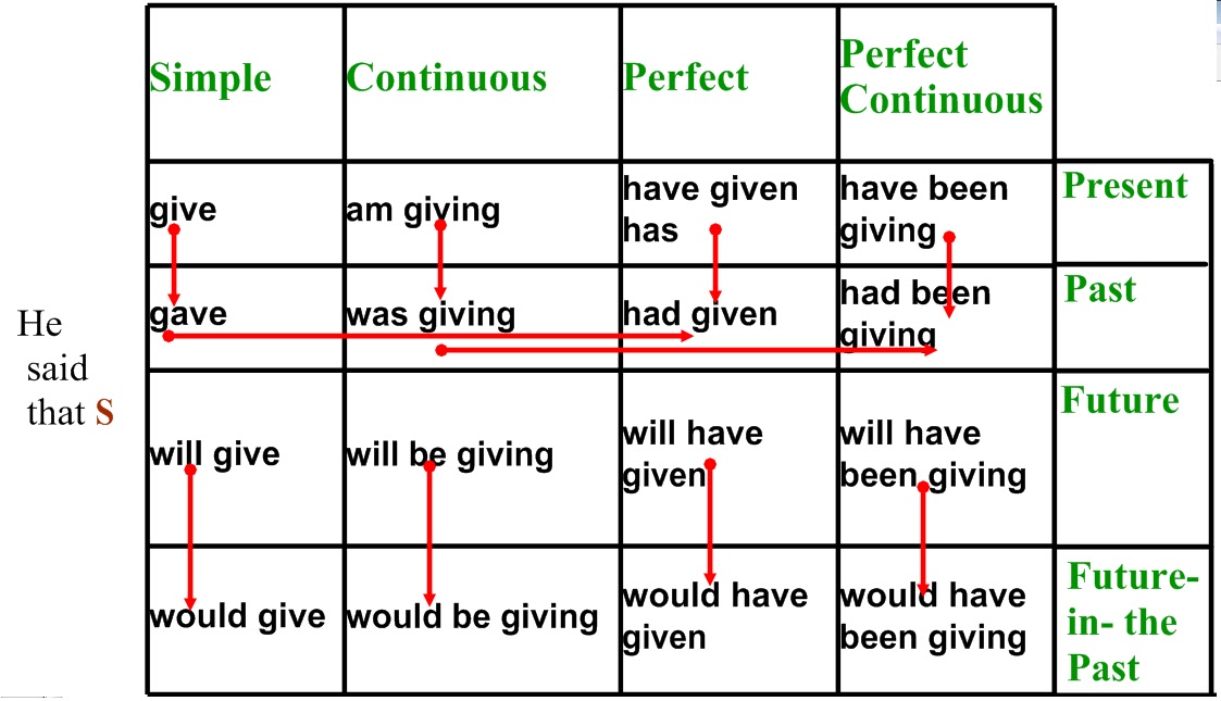 Четыре категории в трёх временны́х координатах порождают 12 возможных форм, которые в совокупности называются “tenses”