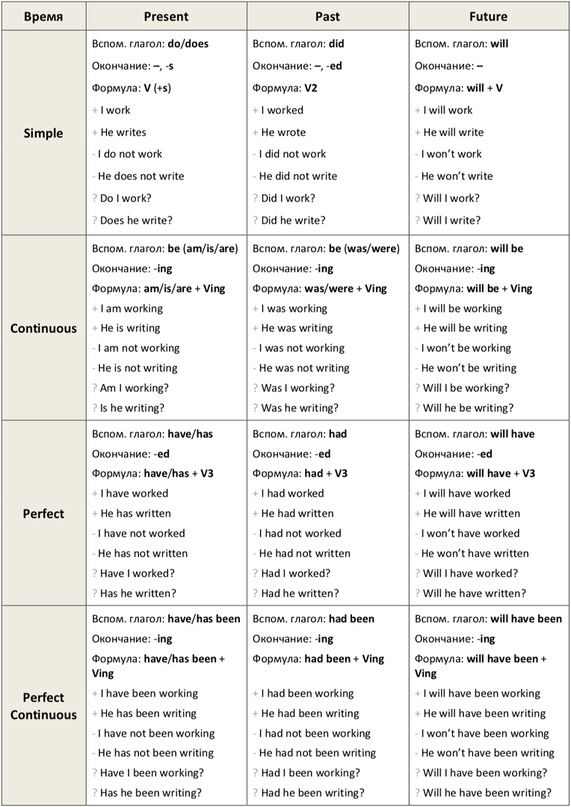 Вот все основные типы времен английского языка. Чтобы получить полное объяснение каждого времени, нажмите на ссылки ниже.