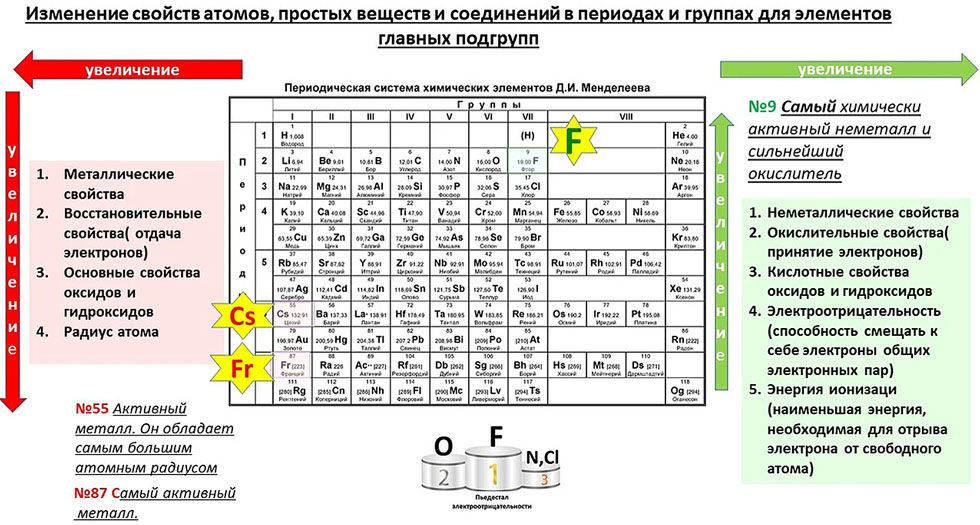 Электрическое расположение элементов во многом определяет их химические и физические свойства. Движение слева направо по периоду приводит к уменьшению атомного и ионного радиусов. В результате с течением времени энтальпия поглощения электронов имеет тенденцию к уменьшению, тогда как энтальпия ионизации обычно возрастает.