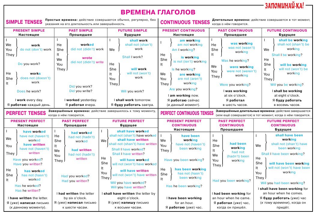 Если от мысли об изучении времен у вас крутит в животике, то самое время взглянуть на обобщающие таблицы времен в английском языке. Благодаря таблицам, можно взглянуть на систему времен со стороны. Это статичная система, с конкретными конструкциями для каждой ситуации. 12 времен могут звучать страшно, однако справиться с ними по плечу каждому.