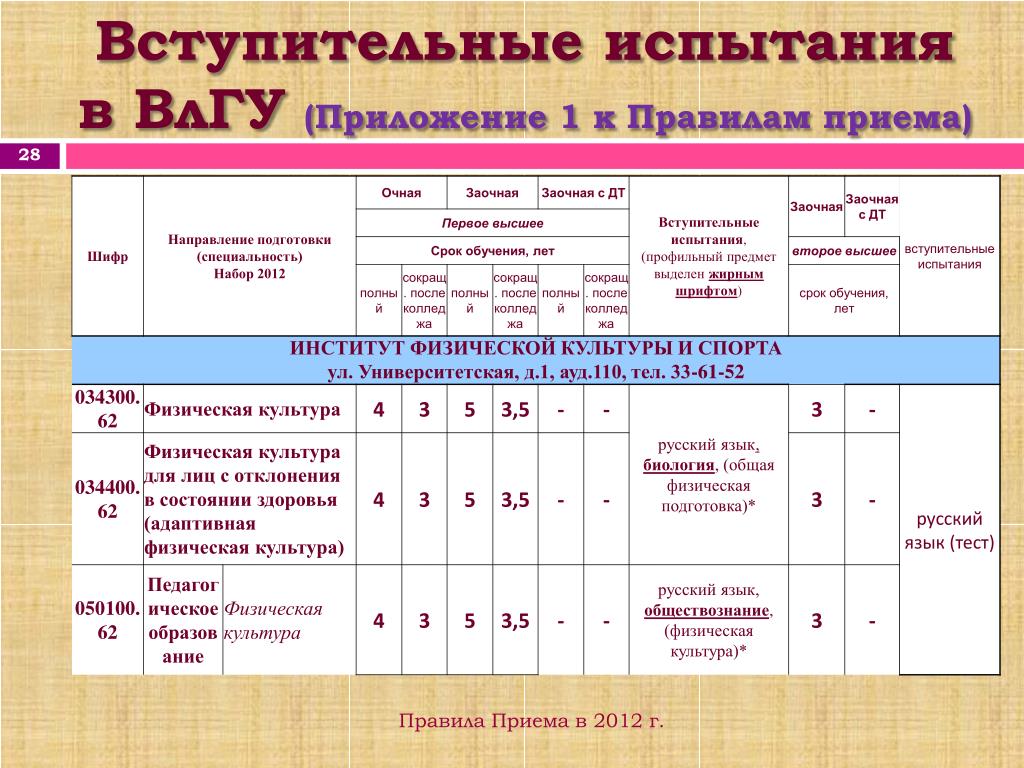 Граждане, имеющие право на приём по результатам вступительных испытаний, проводимых вузом самостоятельно, сдают вступительные экзамены по четырем общеобразовательным предметам, входящим в Перечень вступительных испытаний, на соответствующее направление.