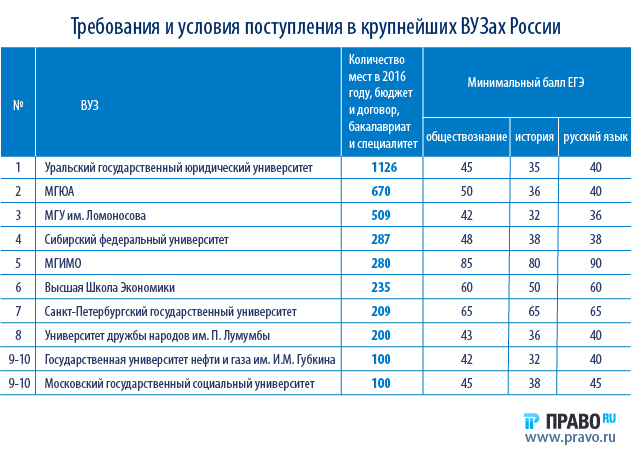 «Юриспруденция» — одна из самых популярных специальностей и представлена практически в каждом российском вузе. Направление отличает большое количество бюджетных мест. Вузы-лидеры по плану приема — это МГЮУ имени Кутафина (545 мест), юридический факультет МГУ имени Ломоносова (304 места), НИУ ВШЭ (142 места). Помимо перечисленных университетов, ведущими вузами по данному направлению считаются МГИМО, Всероссийский государственный университет юстиции, Российский университет правосудия. Даже непрофильные учебные заведения чаще всего принимают на первый курс по 20-30 абитуриентов. Тем не менее в этом году можно отметить незначительно снижение количества мест в НИУ ВШЭ, Финуниверситете, РГУП, РТА и ВАВТ.