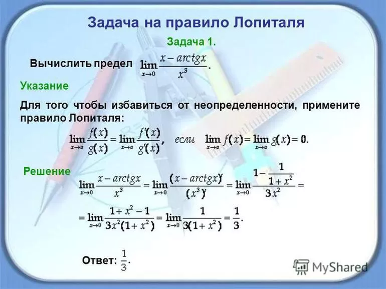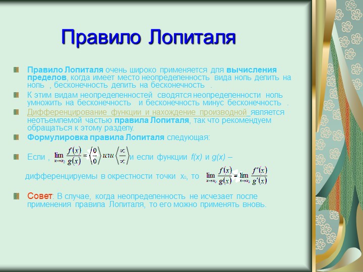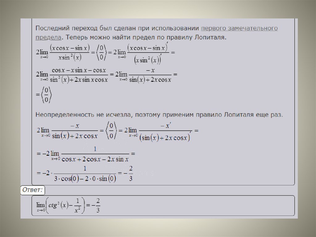 С помощью правила Лопиталя находим пределы. Математика online-формулы по алгебре, геометрии, высшей математике. Справочная информация, статьи, ссылки, биографии ученых.