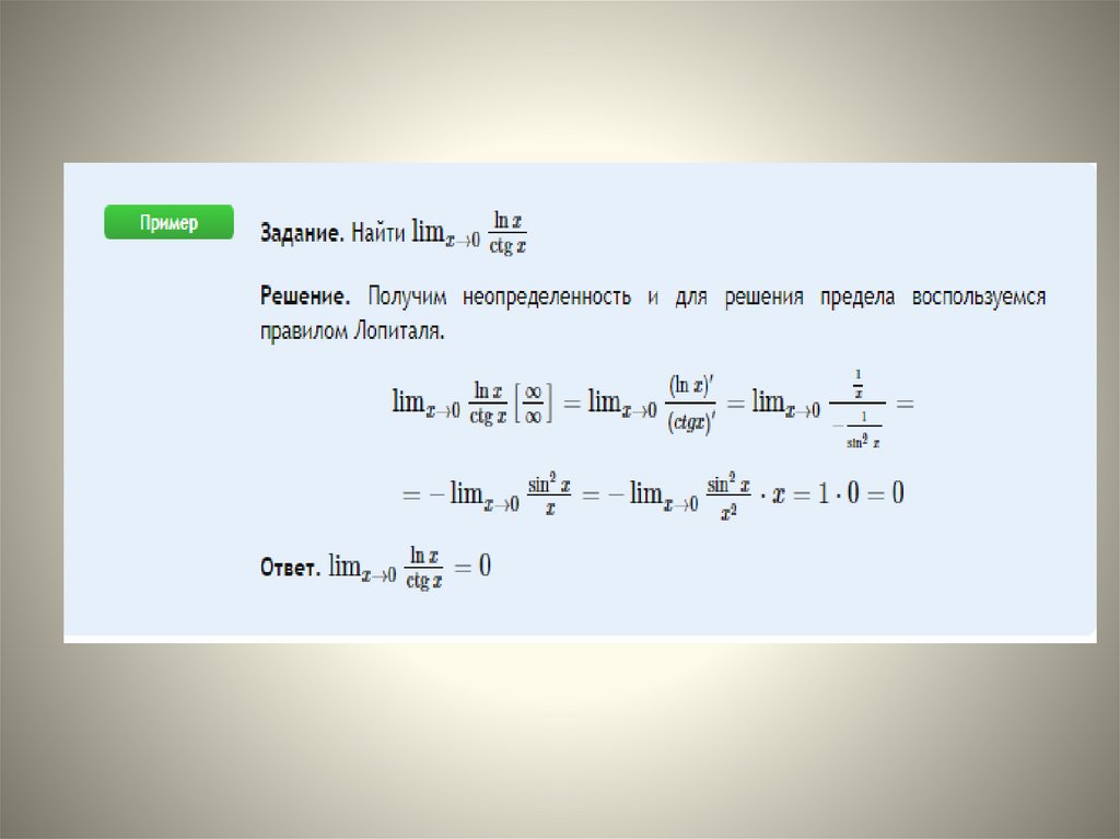 Рассмотрим примеры нахождения пределов функций с использованием правила Лопиталя.