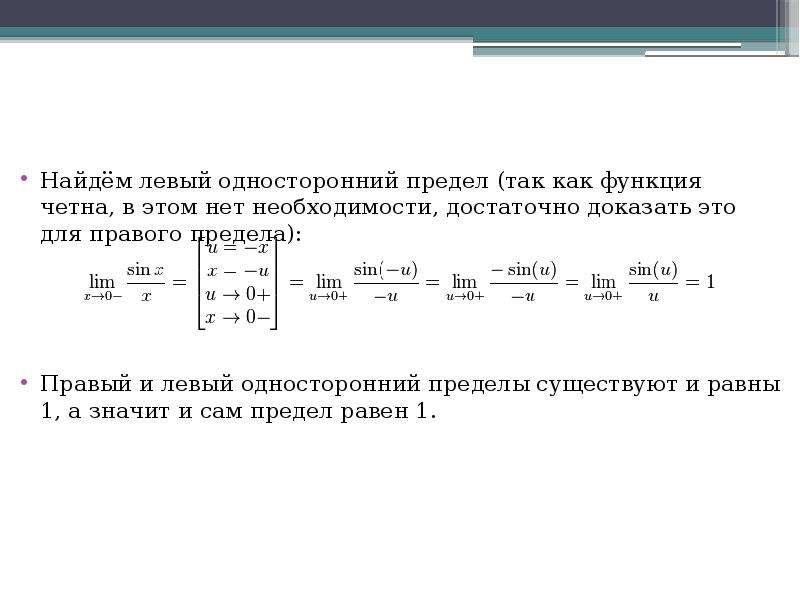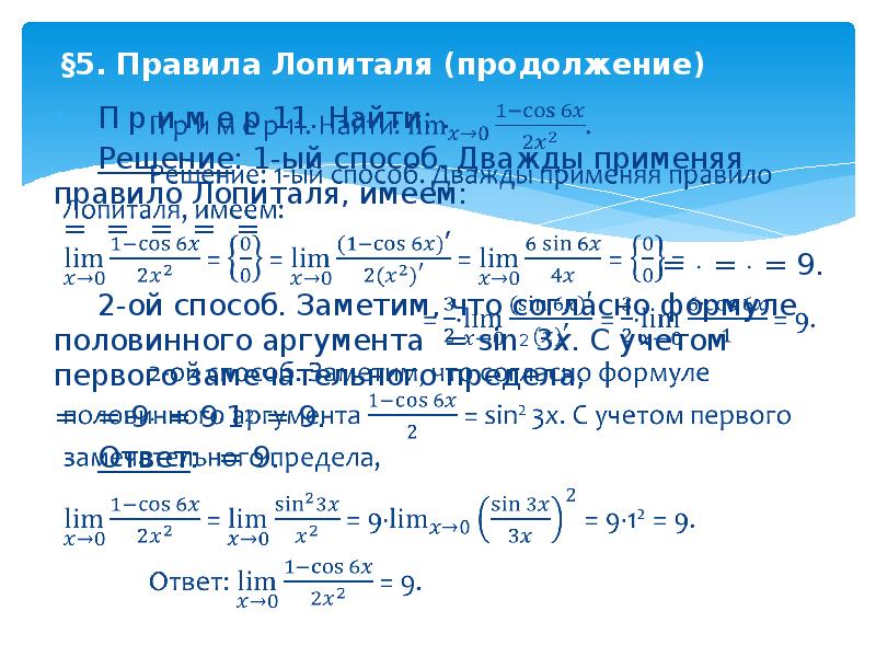 ( x 2 ) и берём предел напрямую, получая 1/2 очень быстро. Пример 2: Рассмотрим предел в 0 из (поскольку х – 1)/ х . Поскольку верх и низ приближаются к 0, можно использовать правило