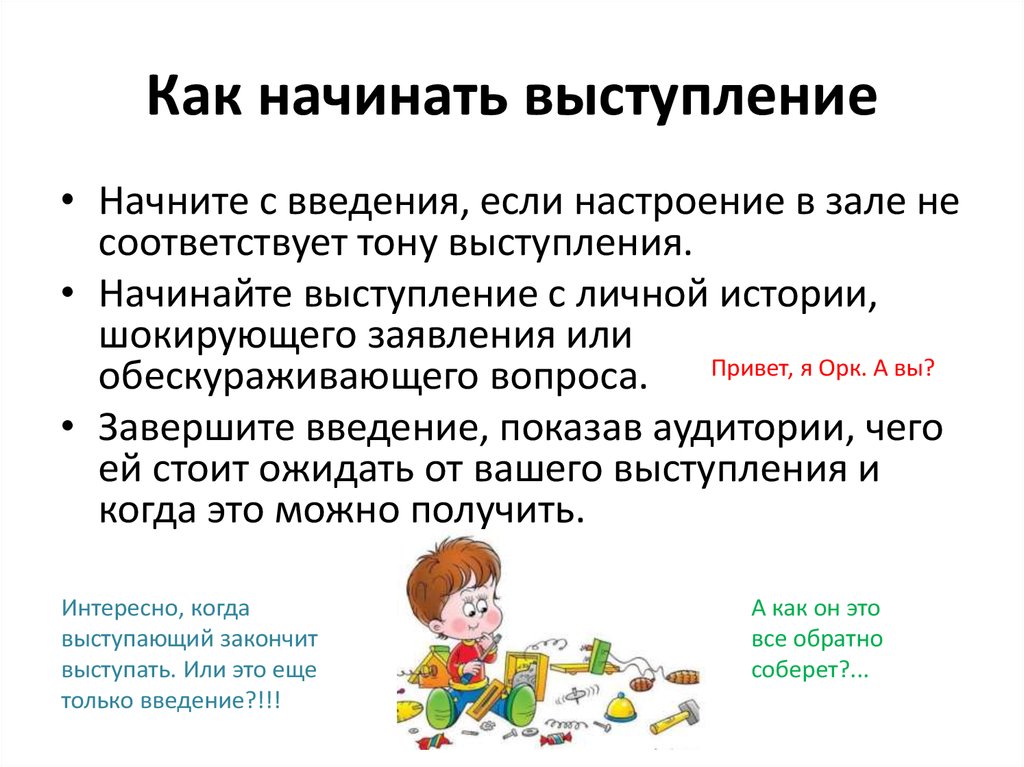 Выразите удовлетворение, что имеете редкую возможность выступить перед коллегами и поделиться с ними опытом в обмен на их опыт. Это позволить аудитории привыкнуть к вам, почувствовать вас, а вот тогда уже можно и за дело. Пожалуйста, если вы используете слайды, не начинайте их показ, пока устраиваете с аудиторией вступительное бла-бла-шоу.
