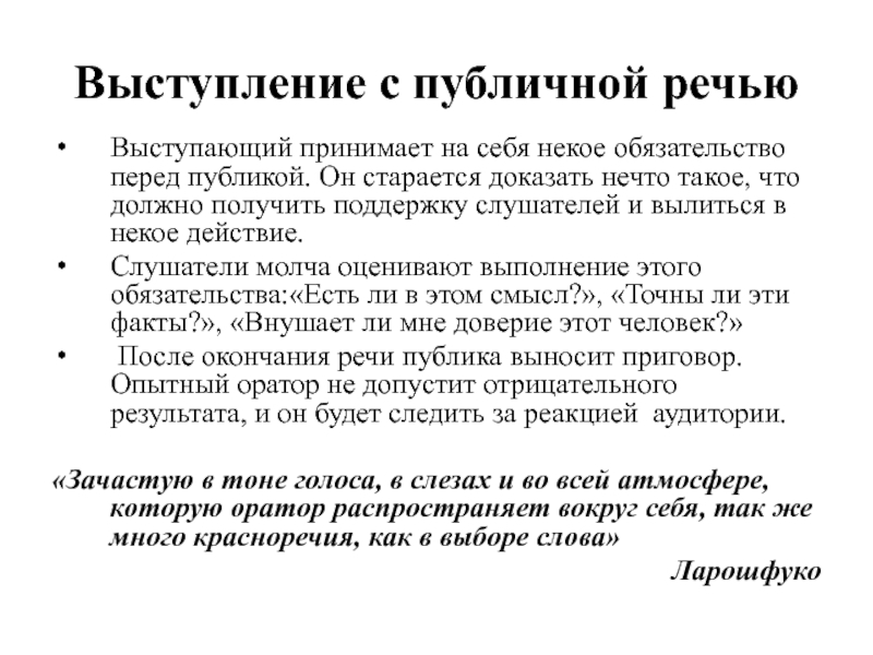 Некий кавалер, желая понравится даме, стал себя хвалить. Рассказывал о своих боевых заслугах, об отношении к себе товарищей, о своих привычках и странностях. За вечер все о себе рассказал. А больше и не нужно. Ибо дама с ним встречаться впредь не пожелала. Почему? Что сделал этот кавалер не так? Верно, он говорил о себе и только о себе. А нужно было, конечно, говорить о даме. Только таким образом можно прослыть прекрасным собеседником и интересным человеком. К чему этот пример, догадаться нетрудно. Постоянно задавайте себе вопрос, не стали ли вы похожи на этого кавалера. Не слишком ли вы увлекаетесь рассказами о своих трудовых подвигах? Достаточно ли вы уделили внимания в докладе тому, чтобы люди, сидящие в аудитории получили информацию, которую могут использовать в своей работе?