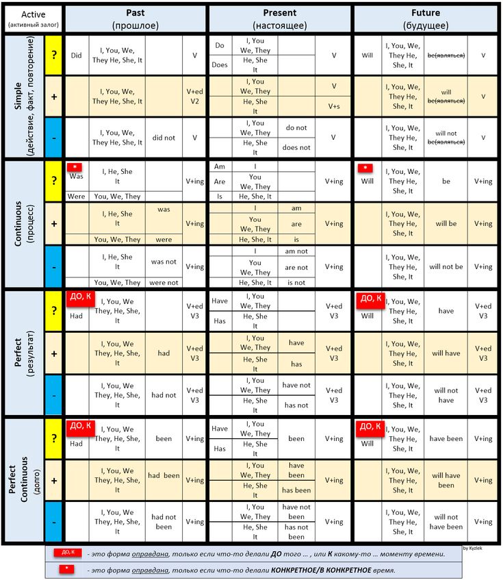 Для того, чтобы запомнить формулу построения предложений, лучше всего использовать таблицу, в ней информация представлена очень кратко и наглядно. Пока вы только учите английские времена, держите такую шпаргалку всегда под рукой, чтобы повторить построение предложений, когда это понадобится.